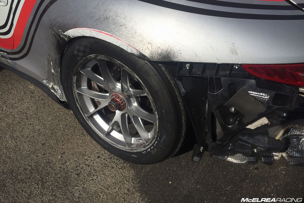 Being the fastest corner on the track with a concrete wall marking the outside of the track, the Ginetta sustained moderate damage to the left side.